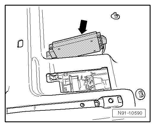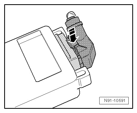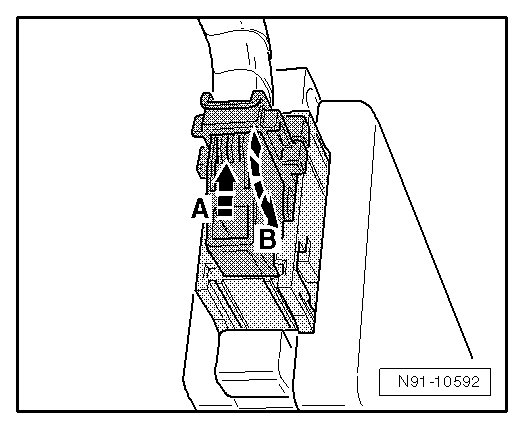 - Press catch - A - on black harness connector and fold the bracket over in direction of arrow - B -.