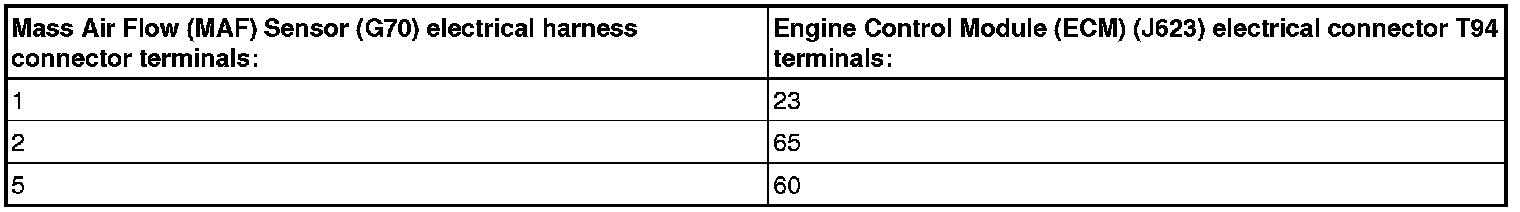 - Using a multimeter, check the Mass Air Flow (MAF) Sensor (G70) electrical harness connector terminals to the Engine Control Module (ECM) (J623) electrical harness connector terminals for an open circuit.