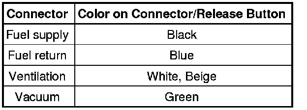 The connectors for the fuel, vacuum and ventilation lines are color coded. There is either a colored dot on the connector or the release button is the corresponding color.