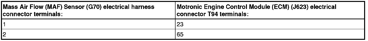 - Using a multimeter, check the Mass Air Flow (MAF) Sensor (G70) electrical harness connector terminals to the Motronic Engine Control Module (ECM) (J623) electrical harness connector T94 terminals for resistance.