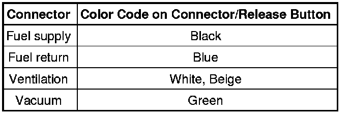 The connectors for the fuel, vacuum and ventilation lines are color coded. There is either a colored dot on the connector or the release button is the corresponding color.