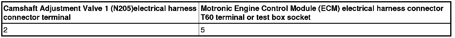 - Using a multimeter, Check the Camshaft Adjustment Valve 1 (N205) electrical harness connector terminal to the Motronic Engine Control Module (ECM) electrical harness connector terminal for an open or high resistance.