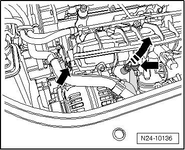 - Loosen the coolant pipe and oil dipstick guide from the intake manifold - arrows - and pull off the oil dipstick guide upward from the engine.