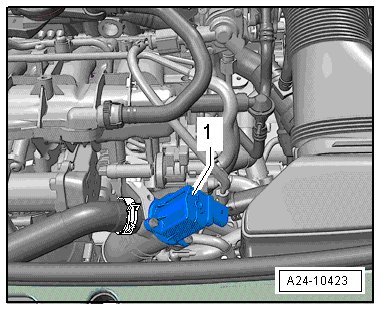 - Remove the turbocharger recirculation valve - 1 - with the intermediate flange and remove the hose. Refer to => [ Charge Air Cooler Overview ] Charge Air Cooler Overview.