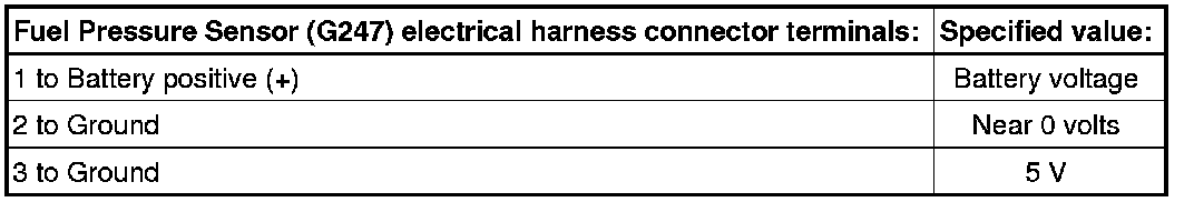 - Using a multimeter, check the Fuel Pressure Sensor (G247) electrical harness connector terminals for voltage.