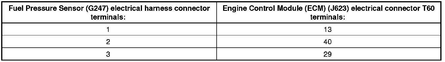 - Using a multimeter, check the Fuel Pressure Sensor (G247) harness connector terminals to the Engine Control Module (ECM) (J623) harness connector for an open circuit according to the chart below.