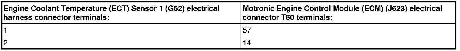 - Using a multimeter, check the Engine Coolant Temperature (ECT) Sensor (G62 or G83) electrical harness connector terminal 1 to the Motronic Engine Control Module (ECM) (J623) electrical harness connector for an open circuit or a short to voltage, refer to the chart below for the appropriate sensor. Refer to Wiring Diagrams for pin locations.