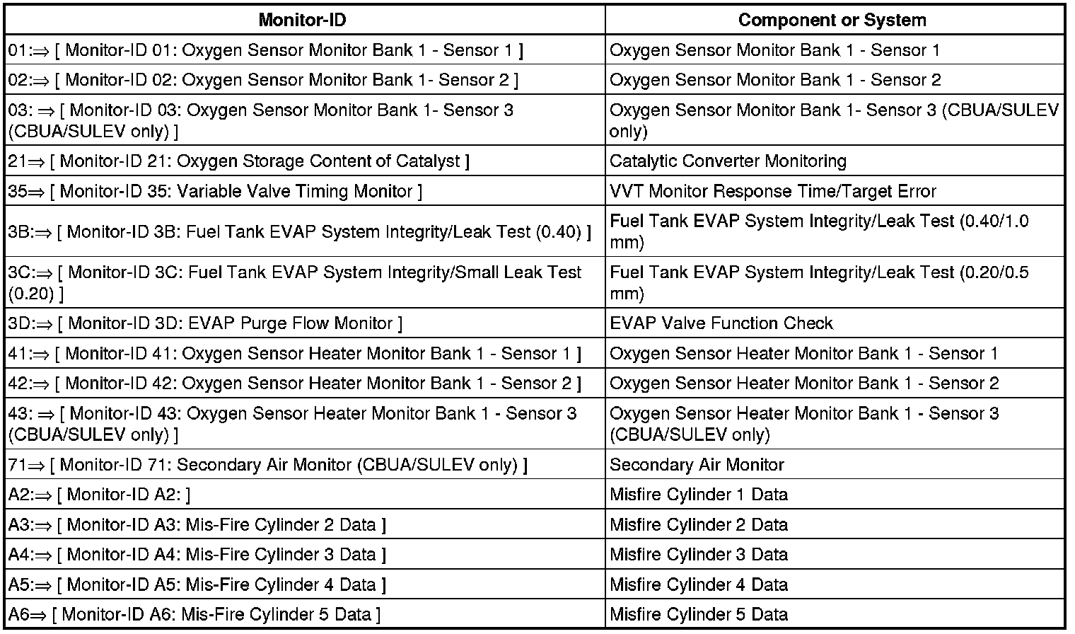 Monitor-ID 03: Oxygen Sensor Monitor Bank 1- Sensor 3 (CBUA/SULEV only)