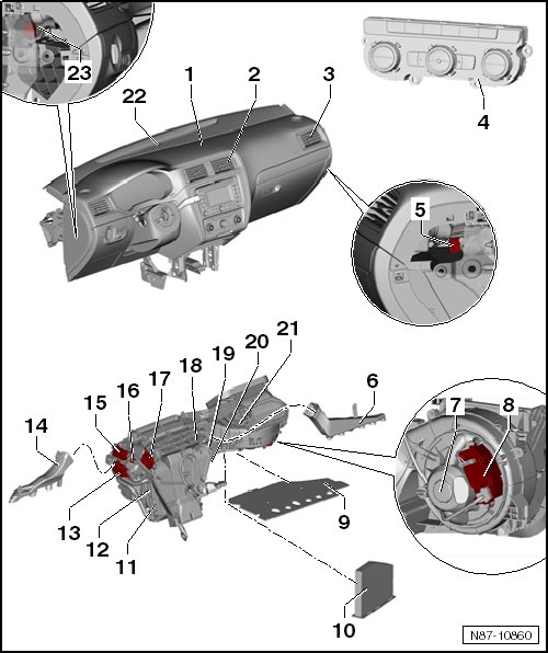 21 - Fresh air/recirculating air/back pressure door motor -V425- with Fresh air/recirculating air/back pressure door motor position sensor -G644- => [ Control Motors On Heating and A/C Unit ] See Image Below.