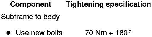- Bolt on subframe to body with additional torque angle using new bolts.