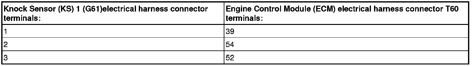 - Using a multimeter, check between terminals 1 to 2 of Knock Sensor (KS) 1 (G61) or Knock Sensor (KS) 2 (G66) for an internal short.