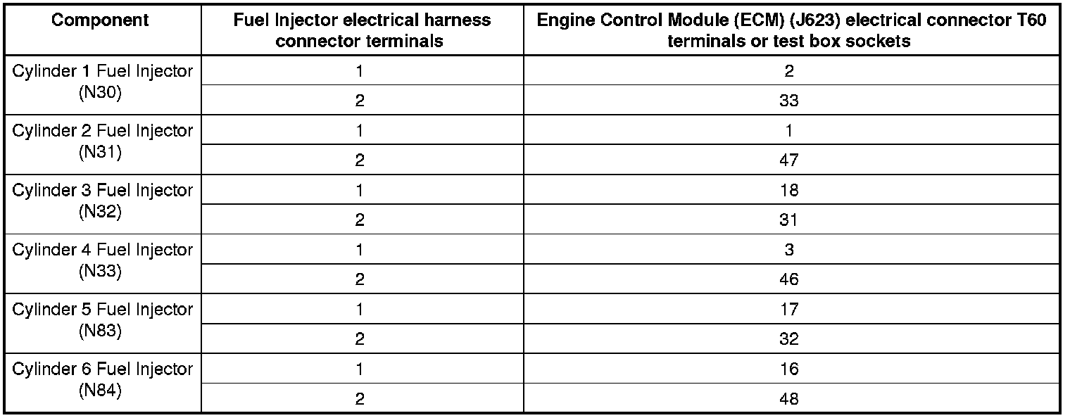 - Using a multimeter, check the fuel injector electrical harness connector terminals to the Engine Control Module (ECM) (J220) electrical harness connector T60 terminals for an open circuit.