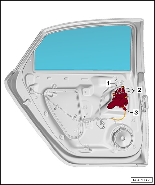 - Install the window regulator motor - 1 - on the mounts in the cable reel. Gently move the door window up and down so that the splines between the window regulator motor and the cable reel can mesh.