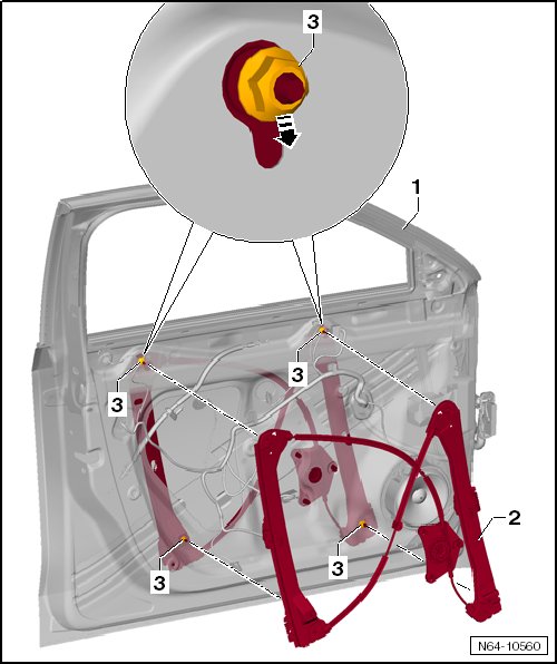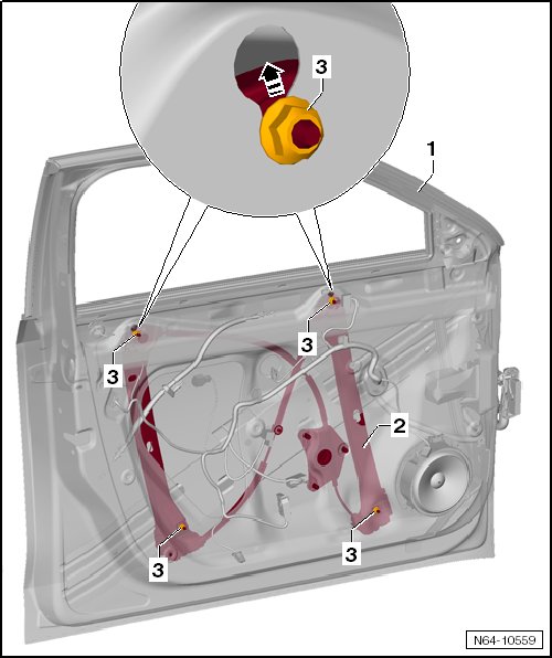- Loosen the top nuts - 3 - (do not remove them), slide them together with the window regulator in - direction of arrow - and push them into the door - 1 -.