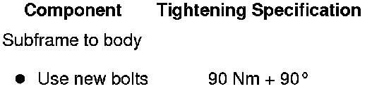 - Replace subframe bolts one after the other on both sides using locating fixtures (T10096) and tighten them to 20 Nm.