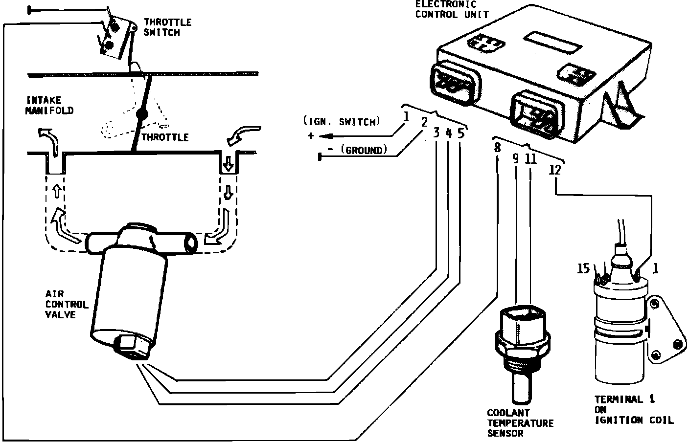 This system, Fig. 1, controls the engine at or near idle by regulating the air control valve. The system is composed of an electronic control unit, air control valve, throttle switch, coolant temperature sensor and the distributor, through the ignition coil.