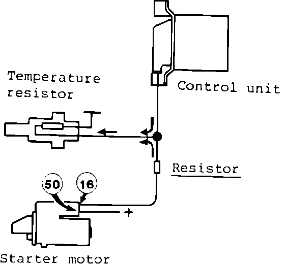 By connecting the "resistance wire" from the starter motor, additional current is supplied to the temperature sensor only while cranking. This additional current from the starter reduces the current flow from the control unit, indicating the engine is colder than it actually is. This permits a richer mixture while cranking and improves starting ability.