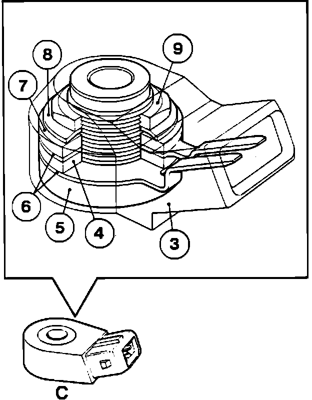 The knock sensor (C) consists of a housing (3) a piezoelectric crystal (4) mounted on a threaded sleeve (5) between two connector strips (6). One side of the assembly is fitted with a damping weight (7) and spring washer (8) secured by a nut (9).