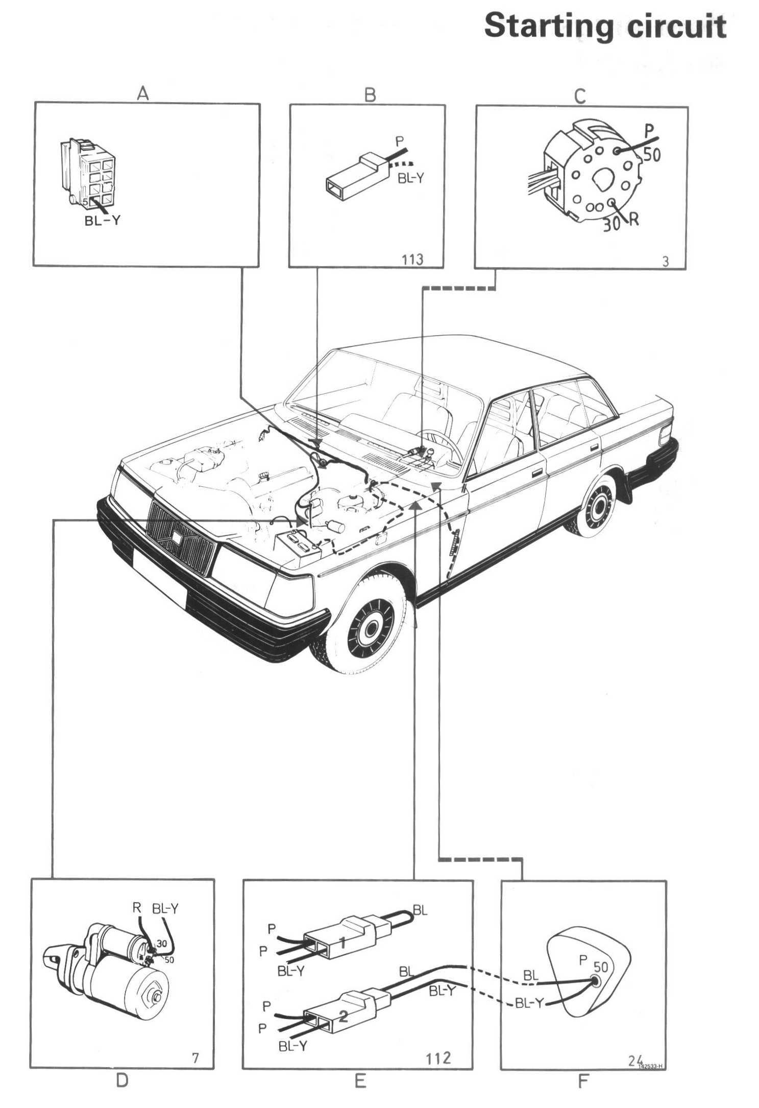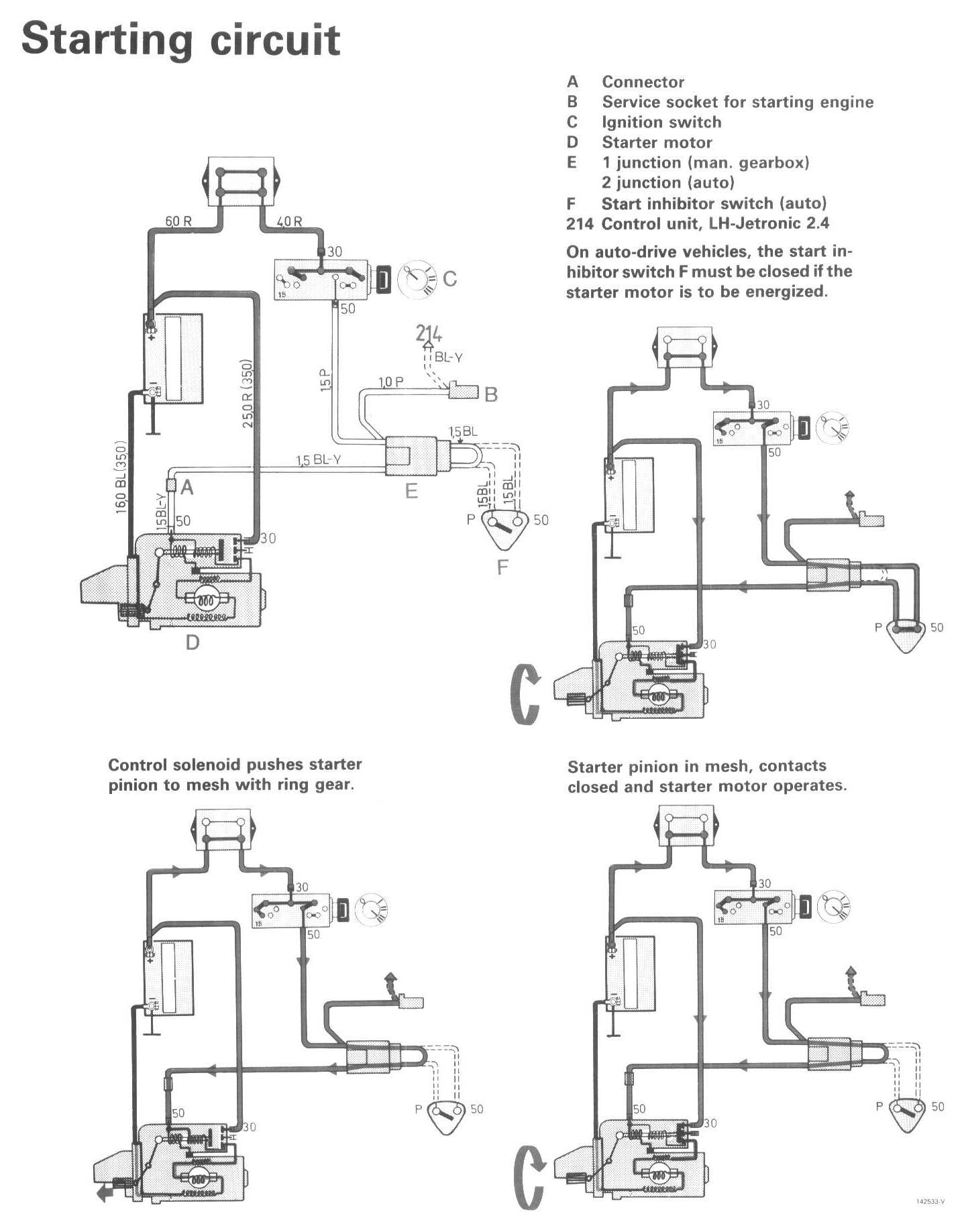 On auto-drive vehicles, the start inhibitor switch F must be closed if the starter motor is to be energized.