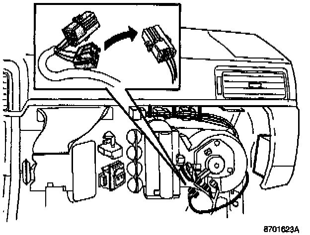 - Locate cable harness with relays between air hose and knee bolster.