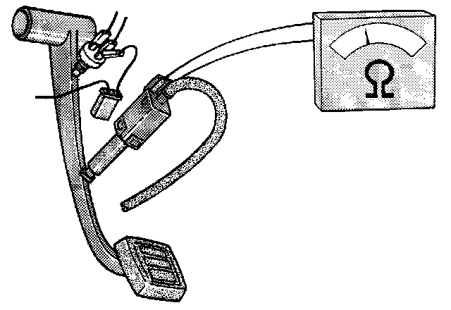 Connect an ohmmeter between the vacuum valve terminals. The resistance must be low (closed circuit) when the pedal is released and infinite (open circuit) when the pedal is depressed.