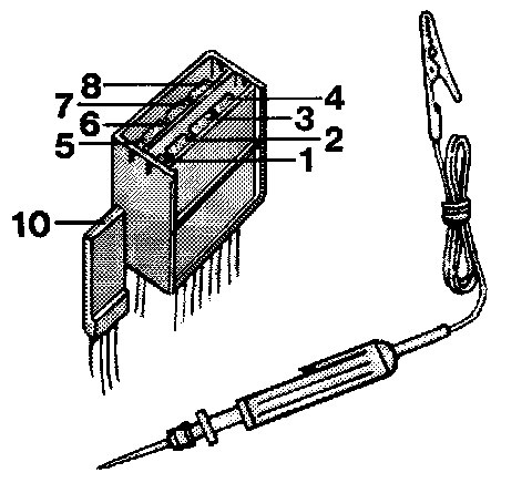 Connect test lamp between ground and terminals 1-10 in the connector. Test lamp should not light up at any of the terminals.
