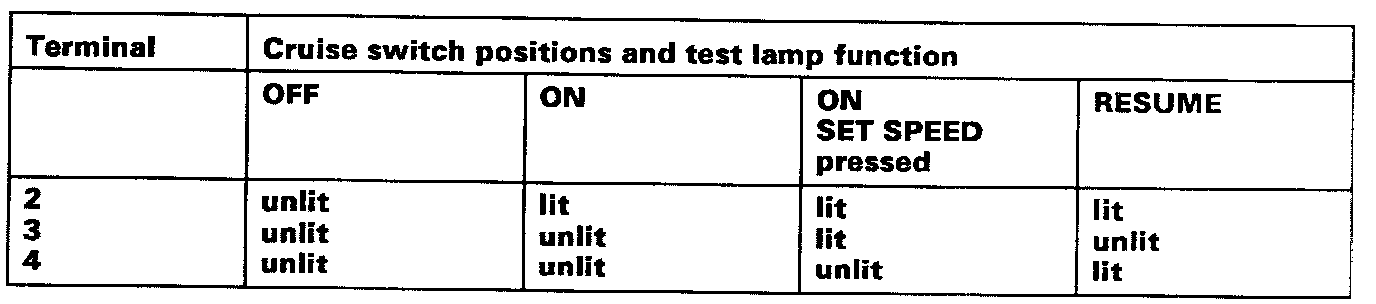Test lamp should light up as shown in table below. If a fault is found, replace the cruise control switch.