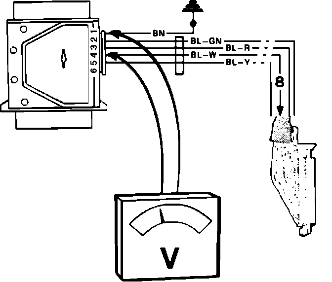 10. Connect voltmeter between mass air flow sensor connection #1 (ground) and #5 (current feed from system relay).