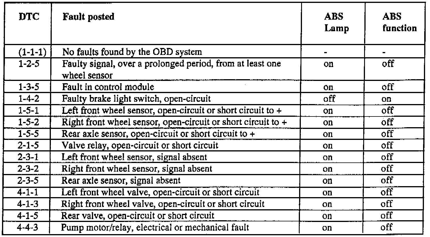 The new control module OBD function is connected to position 3, diagnostic unit A in the engine compartment. When the control module discovers a fault, the ABS indicator lamp lights at the same time as it stores a DTC. During fault tracing/diagnosis the DTC can be read with the VST or by using the LED on the diagnostic unit by activating test function 1. See DTC table.