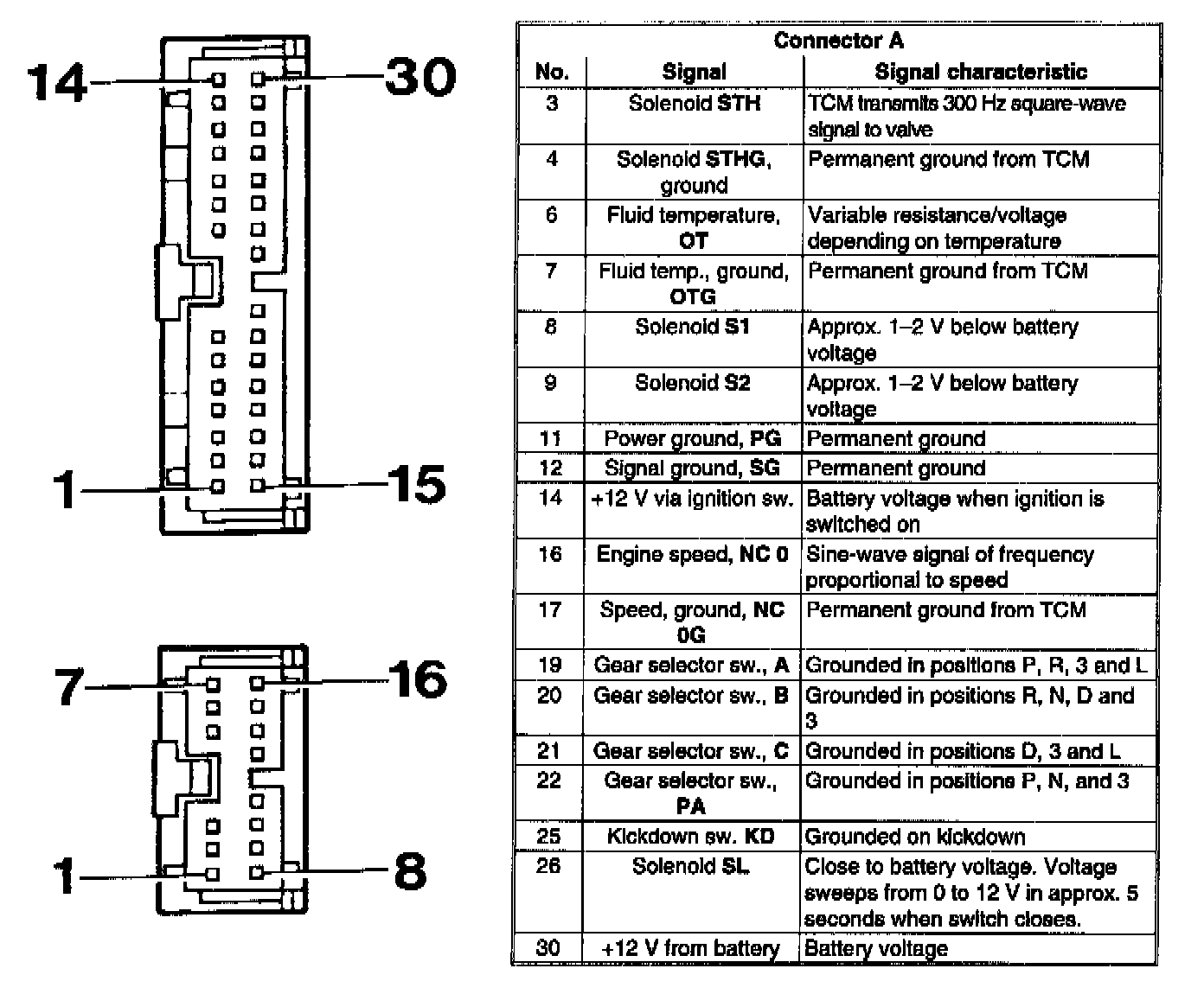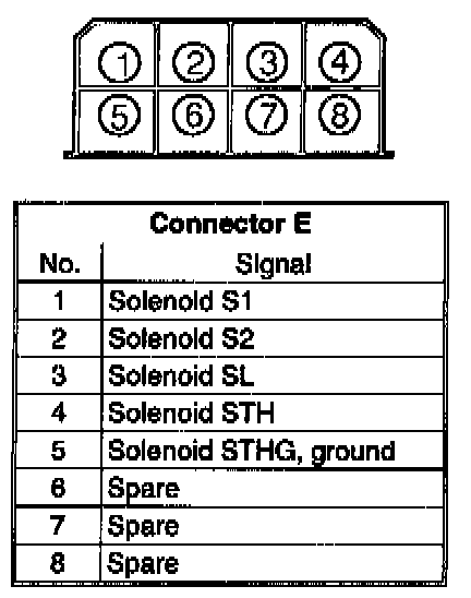 The transmission control system incorporates five unique connectors, two connected to the TCM and two to the transmission itself. Otherwise, the transmission control system wiring is incorporated in the ordinary wiring harnesses, mainly on the left-hand side of the car.