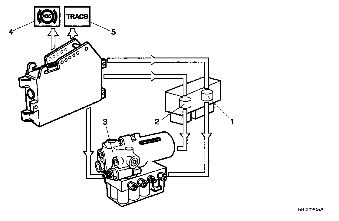 - Solenoid hydraulic valves under ABS and TRACS control (3).