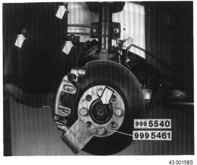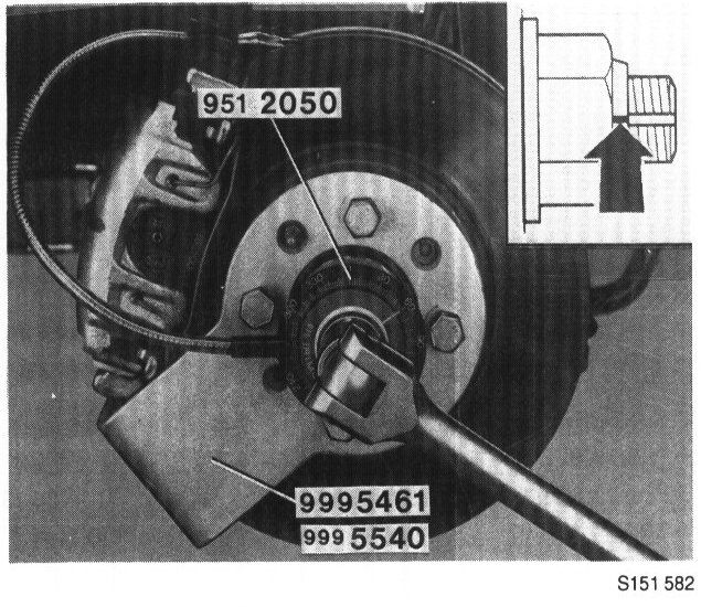 Free the nuts of the locking tabs. (Only applies to early versions.) Install counterhold 999 5461 (4 wheel studs) or 999 5540 (5 wheel studs). Remove nut.