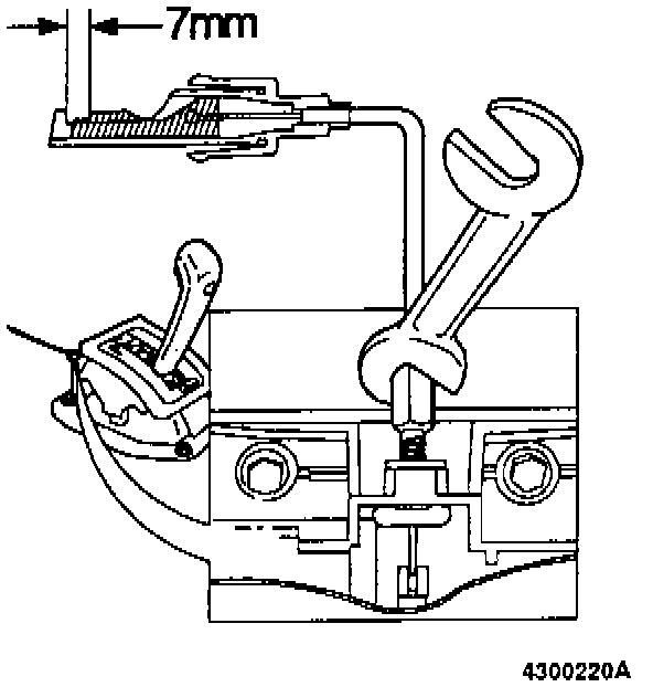 Adjust cable at gear lever end until clearance between locking tabs at ignition switch end is approx. 7 mm (0.27 in.) (as illustrated).