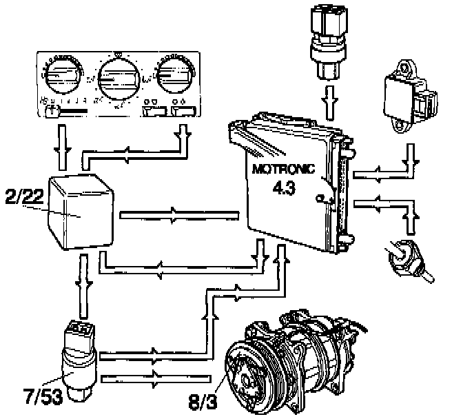 The A/C relay (2/22) is activated if the A/C switch is operated while the blower is running and system operation is enabled by the ECM. Power is then supplied to the A/C compressor electromagnetic clutch (8/3) and cycling of the compressor is controlled in the normal manner by the pressostat (7/53).