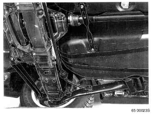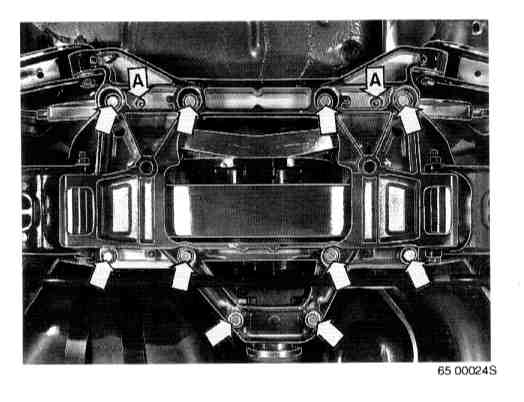 NOTE: Press the parking brake cables to one side so they are not damaged by the pins.