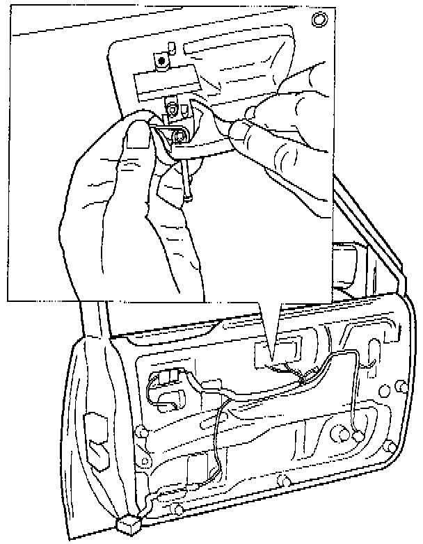 The replacement is carried out without removing the handle from the door. Since only the spring. pin and inner door opening control mechanism will be sold as replacement parts (besides the inner door handle complete with cables), it is not necessary to remove the inner handle from the door when the spring or pin is to be replaced.
