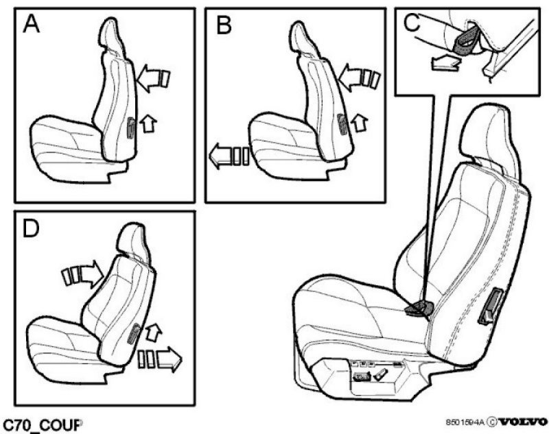 A pull strap (Fig. C) beside the inner seat rail is provided to allow the front seat backrest to be folded down and the seat to be moved forward from the rear seat. The strap has the same function as the lever on the backrest. The backrest latch is released and the seat moves forward when the strap is pulled.The seat stops as soon as the strap is released.