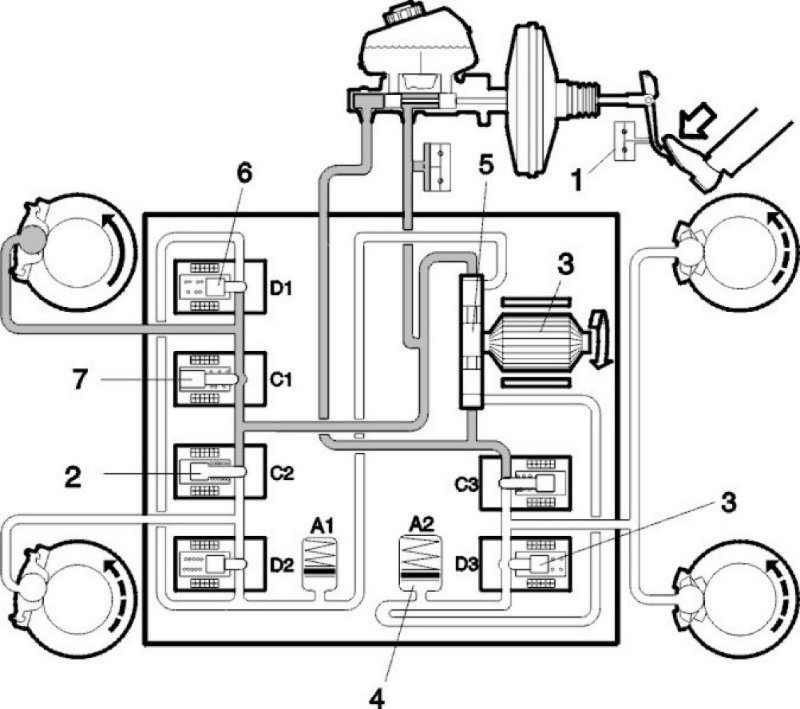 If the wheel is still threatening to lock, the outlet valve (3) opens so that brake fluid returns to the low pressure accumulators (4) with the result that the pressure in the brake circuit is reduced (pressure dumping). This reduces the hydraulic pressure and, thus, also the braking effect so that the wheel picks up speed. The hydraulic pump (5) returns brake fluid from the low pressure accumulators to the master cylinder.