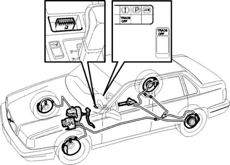 ABS/EBD/TRACS has a built-in diagnostic function, Volvo Diagnostics. The signals from the system sensors are monitored continuously. If there is a fault in the system, the ABS, EBD or TRACS system is disabled partly or completely and a warning indicator comes on, on the instrument panel (dashboard). Any faults are recorded by the system control module and can be read out via Volvo Diagnostics using a Volvo System Tester connected to the DLC on the console in front of the gear lever. Volvo diagnostics can also be used to read out the values and status of the control module input and output signals. The ABS warning light flashes while the diagnostic system is activated.