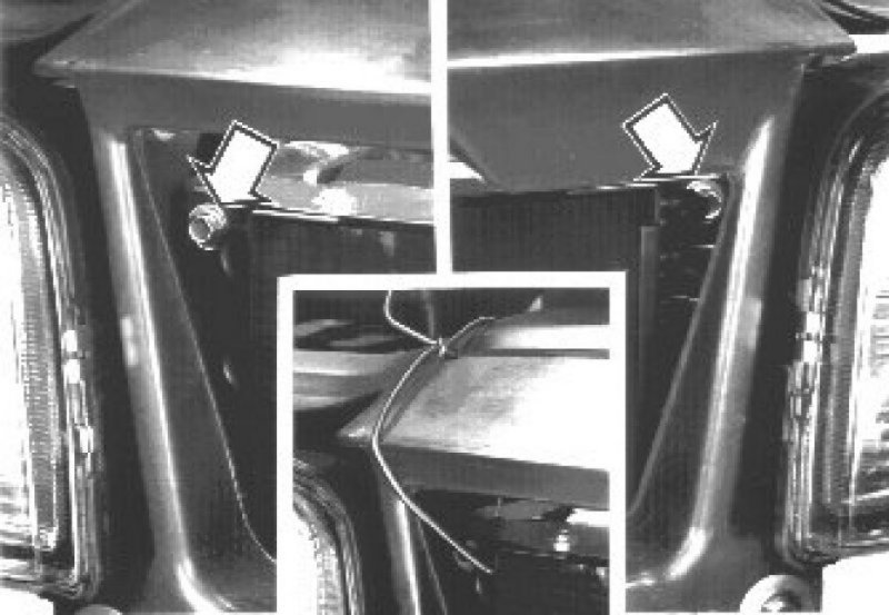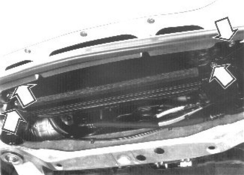 Raise the car. Tighten the lower screws holding the AC condenser to the radiator.