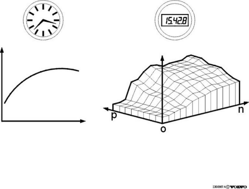 Electronic systems operate digitally (digit = number). This means that only the digit values are stored in the control module memory. The number of digits or values is extremely high. The illustration shows an example of how this may look. Each point of intersection between the lines corresponds to a stored value.