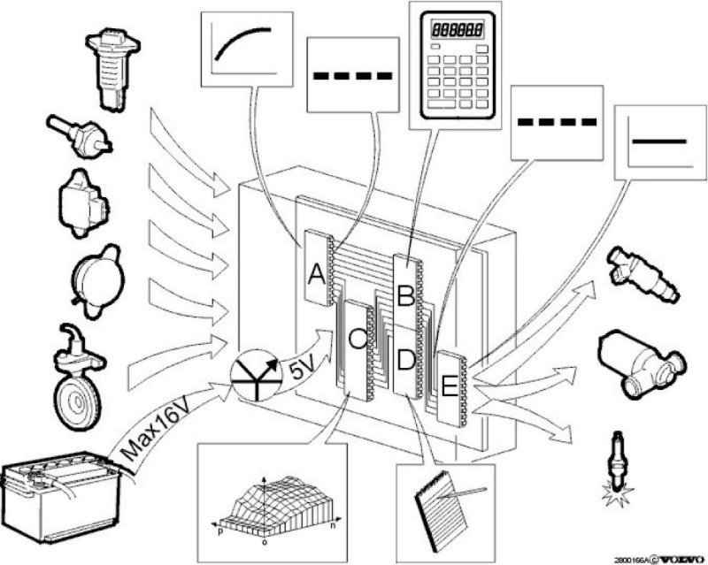 The control module reads off the engine operating conditions, for example engine speed (RPM) and air flow. It then checks its memory for the correct numerical value for, for example, the quantity of fuel. If there is no value which exactly corresponds to the engine operating conditions, the control module calculates a reasonable value itself.