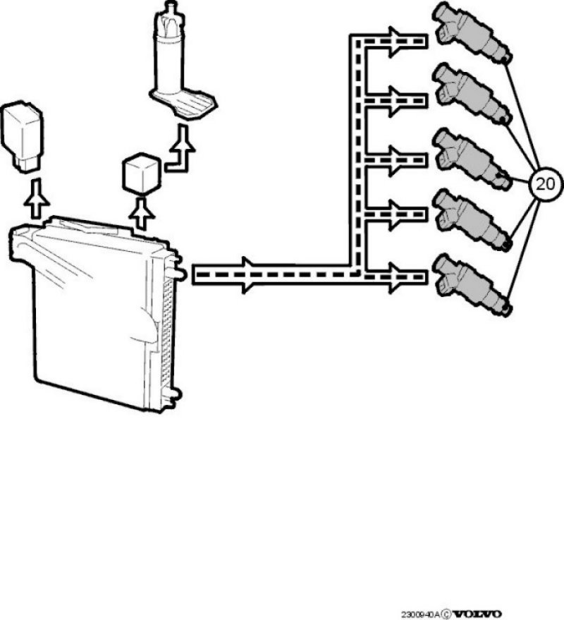 The control module (1) activates the system relay (17) when the ignition is switched on. The relay provides the various components in the system with voltage, for example the injectors, idle air control (IAC) valve and pump relay (18).