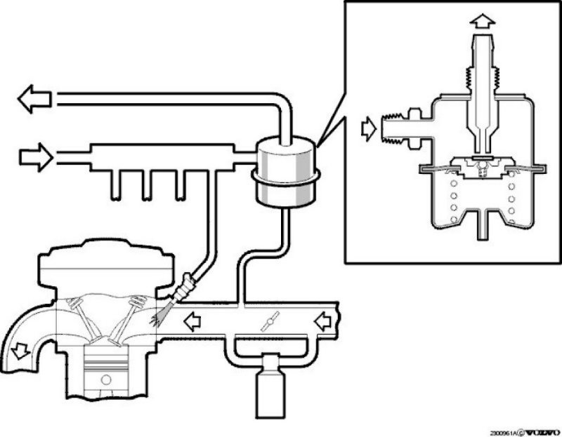 The fuel pressure regulator is affected by the pressure in the intake manifold. It regulates the fuel pressure so that it is always kept at a constant level above the pressure in the intake manifold. Excess fuel is guided back to the fuel tank.