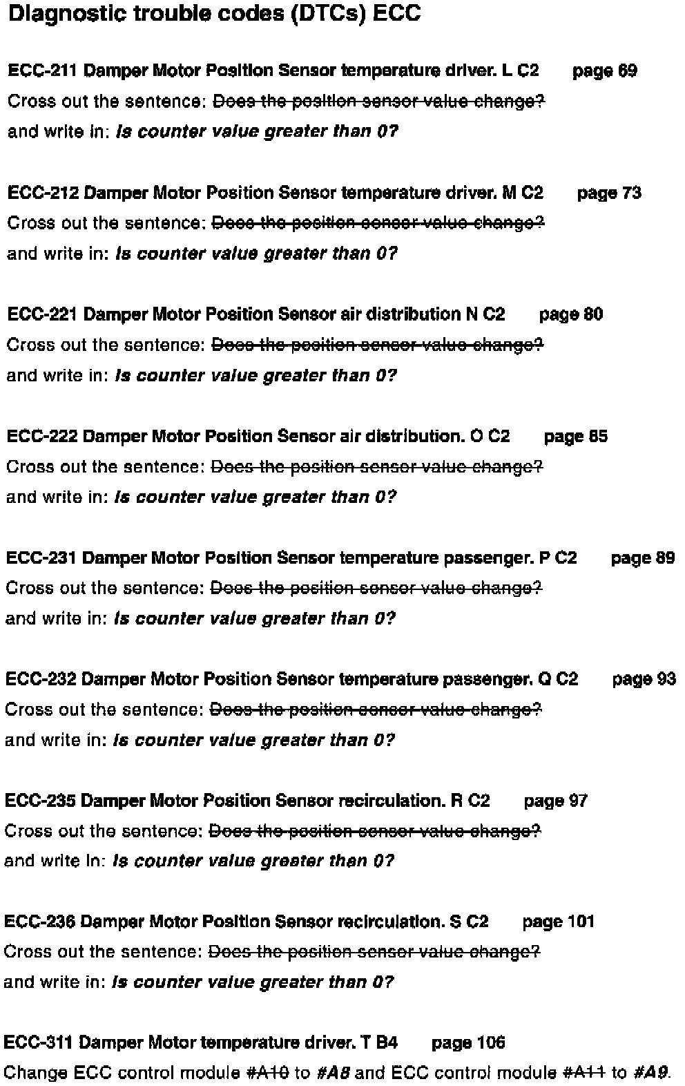 7. QA. Diagnostic trouble codes (DTCs) ECC. (ECC-232 Damper Motor Position Sensor temperature passenger.) Stick over Possible source and Fault symptom(s), page 91.