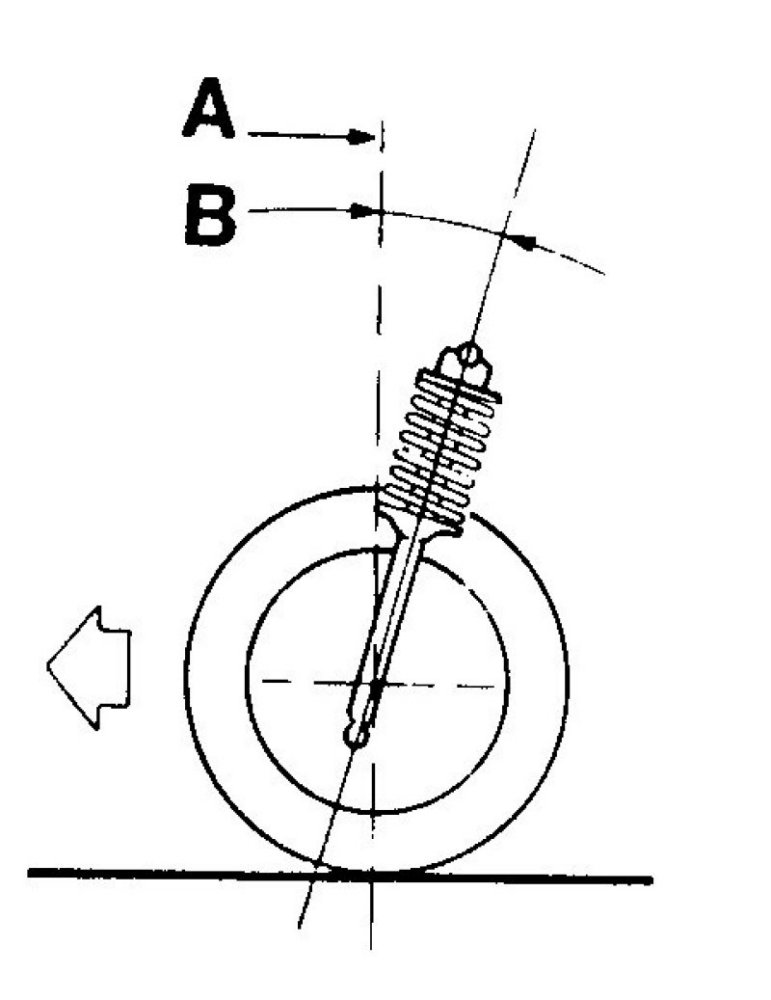 The caster angle (B) is the angle between vertical line (A) and a line which goes through the center of the lower ball joint and upper bearing (in other words a line through the spring strut) Caster encourages the wheel to travel straight forward and so makes steering easier. In addition the greater the caster angle the greater the self-centering effect.