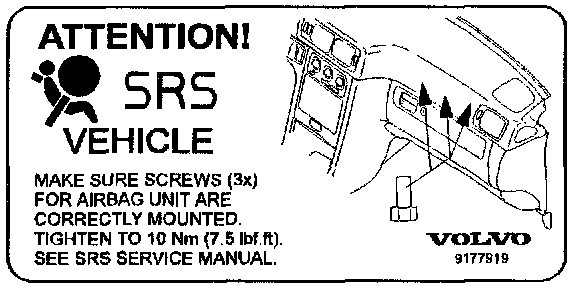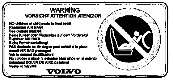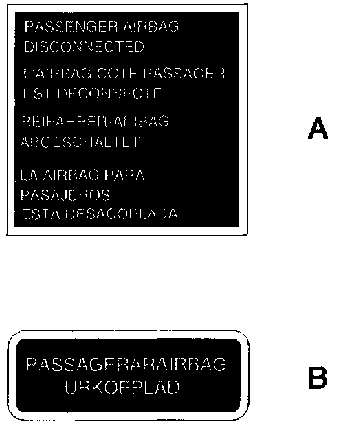 The label situated on the right corner of the glove compartment shows that the passenger side airbag module is disconnected. The label written in four languages is used in all markets (except Sweden).
