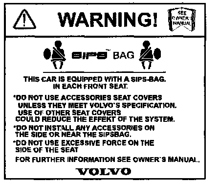 The label warns against using upholstery covers that do not meet Volvo's specifications for the driver/passenger front seats, and do not install accessories at the side of, or near the SIPS bag.