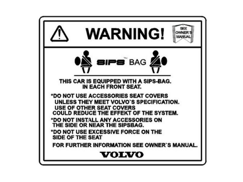 The decal warns against using upholstery that does not conform to Volvo safety specifications on the driver's seat and front passenger seat, and that accessories must not be installed on the side or in the vicinity of SIPS airbags.
