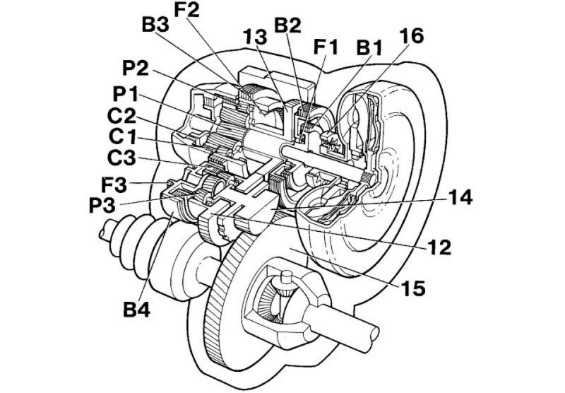 The transverse automatic transmission contains three planetary trains with the accompanying brakes, clutches and freewheels. The twin shafts (a primary and secondary shaft), are located side by side. The rear (P1) and front planetary trains (P2) form the primary shaft of the transmission. P1 is a single planetary train. P2 has double planetary gear sets, an inner set consisting of the long planetary gears and an outer set consisting of the short planetary gears. The inner planetary gear, like the sun gear shaft, is common to both P1 and P2. The single planetary train P3 comprises the secondary shaft of the transmission.